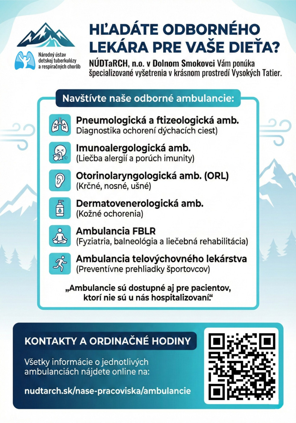 Od 1.8.2024 rozširujeme poskytovanú ústavnú zdravotnú starostlivosť v programe pediatrická pneumológia a ftizeológia o vybrané diagnózy v medicínskych programoch: